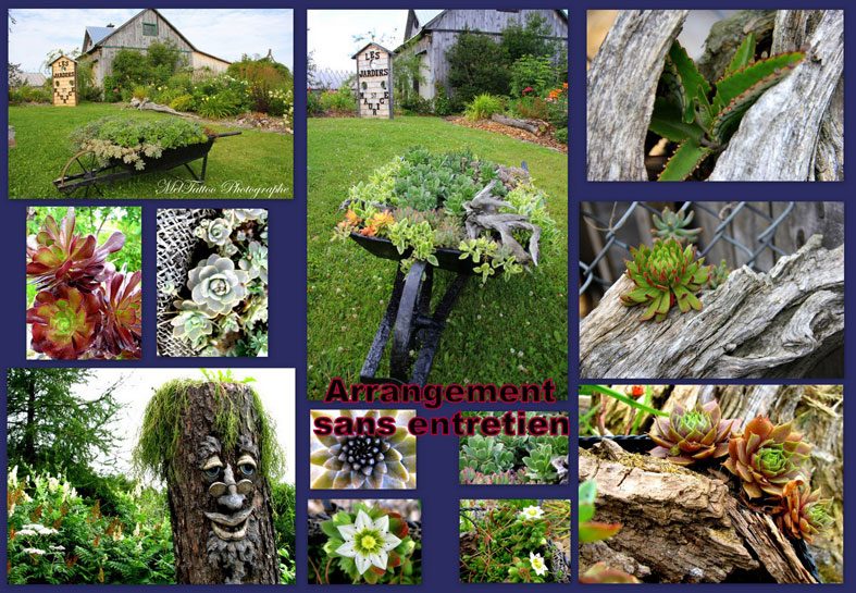 1 - Mon grand-père se promenait et plantait des saules lauriers partout en bordure du terrain et de l’étang. Un insecte (la chrysomèle versicolore) s’est attaqué à tous les saules lauriers de l’Abitibi à partir des années 1990. Donc 2006 et 2007 ont été des années où presque tous les propriétaires ont dû couper leurs saules. Moi, j’ai trouvé une deuxième vie à leur tronc: je m’en sers comme support pour mettre mes pots en évidence et quand ils commencent à pourrir, je fais couper l’intérieur et je m’en sers comme pot de fleur. Je préfère y mettre des plantes grasses comme cela je n’ai pas besoin d’arroser les souches qui sont devenues des pots décoratifs. Et les plantes grasses vont être belles jusqu’à fin septembre - début octobre. Même si les gelées sont fréquentes, elles restent belles jusqu’à des températures de -10 oC.