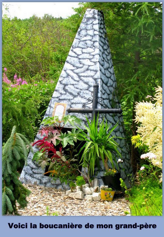 l’ouverture officielle de mes jardins (15 Juillet 2001), Monsieur l’abbé Bilodeau m’a informée que c’était le clocher de l’église construite en 1930 et qui était passé au feu en partie! Après cette découverte un habitant du village m’a donné la croix faite en fonte qui allait sur le clocher.